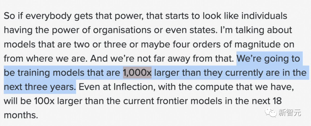 即便是Inflection AI,也能在未来18个月内获得比现在最前沿的模型大100倍的计算能力。