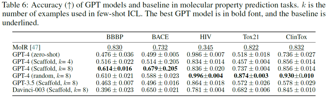 结果在表5中以F1表示,准确度在表6中。观察到,在4/5 (2/5)的数据集上,GPT模型在F1方面优于基线模型。在所检查的GPT-4模型范围内,GPT-4在预测分子性质方面超过了Davinci-003和GPT-3.5。在的研究中,发现有样本的情景学习(ICL)会显著提高模型性能。这表明ICL的数据量与模型的预测精度之间的直接关系。同时,的研究提供了经验证据,证明基于scaffold相似性筛选的性能在三个不同的数据集(BBBP、BACE、Tox21)上超过了随机采样的性能。对此的一个合理解释可能是样本骨架分子和查询分子之间的结构具有一定的相似,这可能会使GPT模型偏向于更准确的决策。