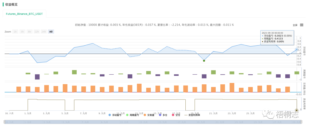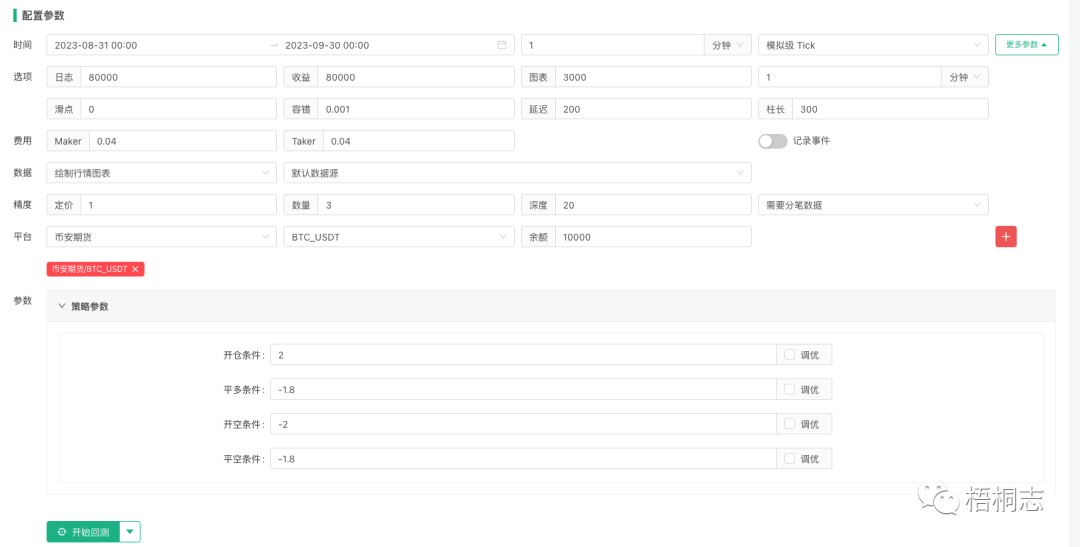 使用fmz提供的回测功能,我们用Binance合约过去1个月的数据进行测试。