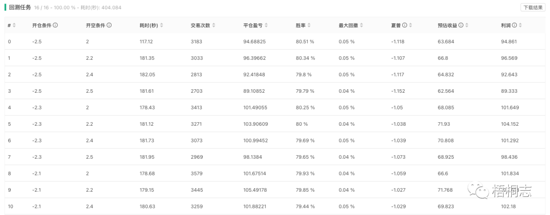 从图中的数据可以看到参数收益最好的是开多条件-2.1、开空条件2.2,年化收益大约11.5%;胜率最高的是开多条件-2.5、开空条件2,达到80.51%。