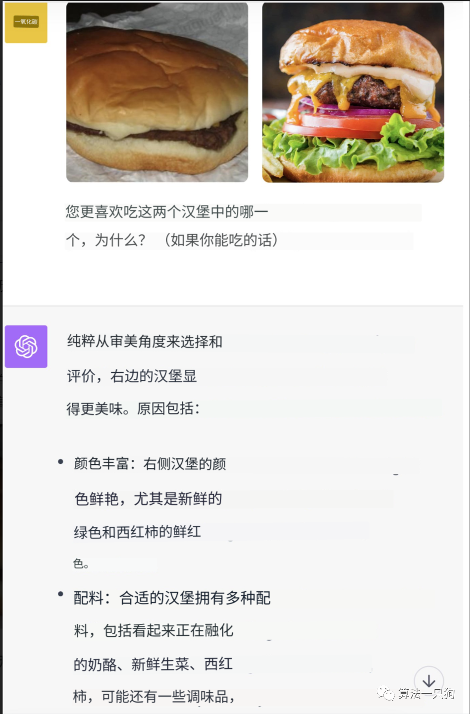 一次性输入多张图片不仅仅是单一图片的输入,新的ChatGPT能够一次性处理多张图片。比如下面对比两个汉堡的问题,询问ChatGPT哪个更美味。