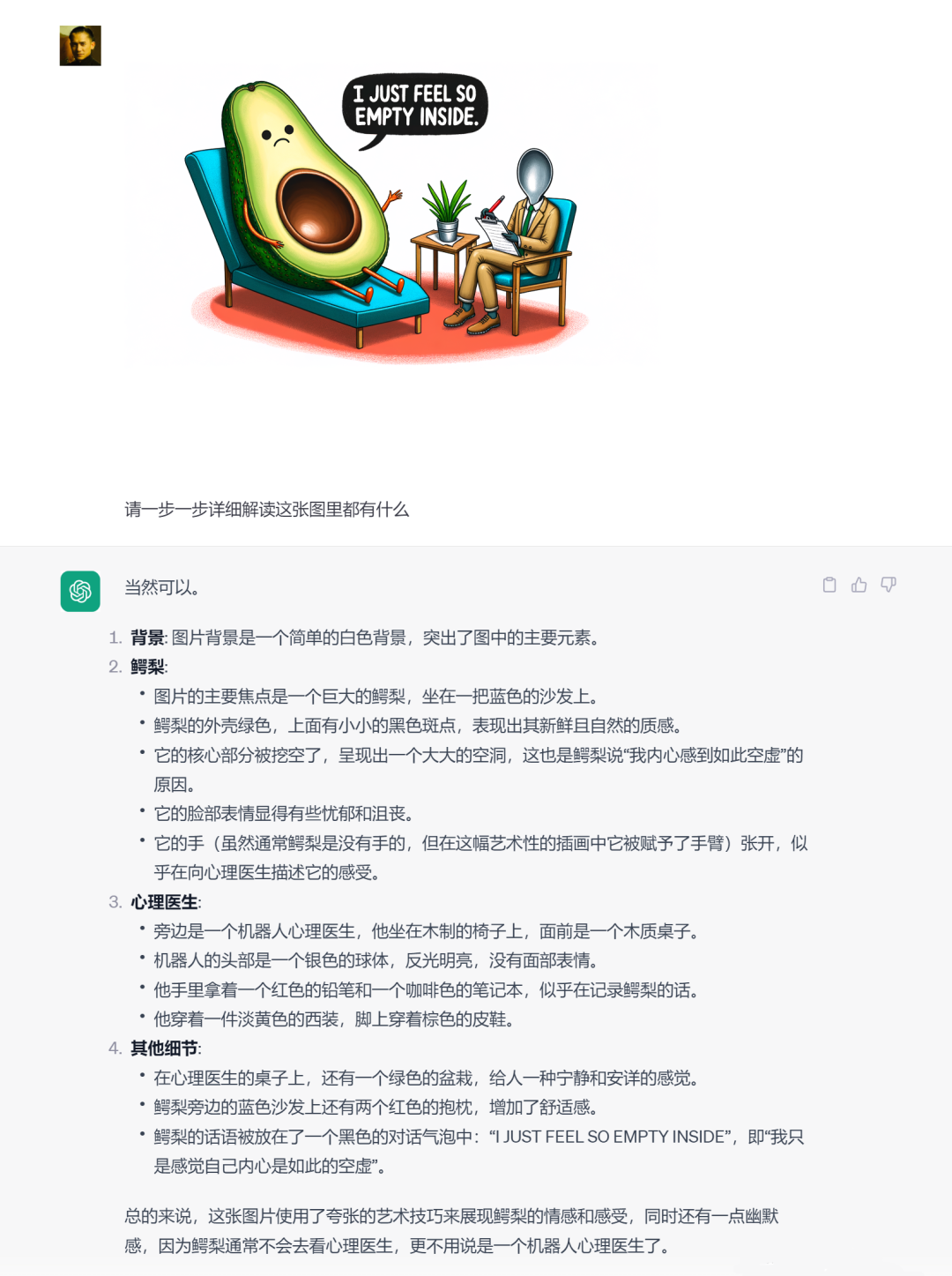 以上案例,考验更多是ChatGPT信息获取及识别能力,挖掘图片中的”隐藏图义“,更考验ChatGPT对人类的社交、心理等综合性的理解。