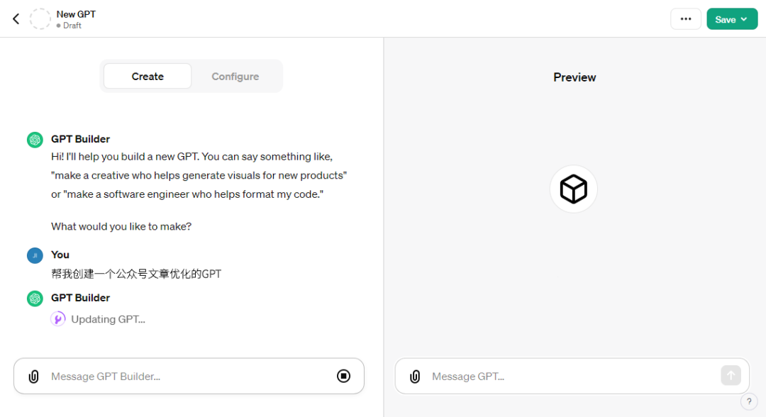 2、创建过程中,可以与GPT直接对话,无需编写代码。例如,输入“帮我创建一个公众号文章优化的GPT”,GPT便会开始执行创建动作;