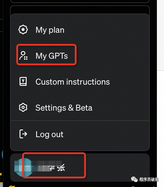 2.1 点击chatgpt控制台左下角的用户信息,选择My GPTs按钮