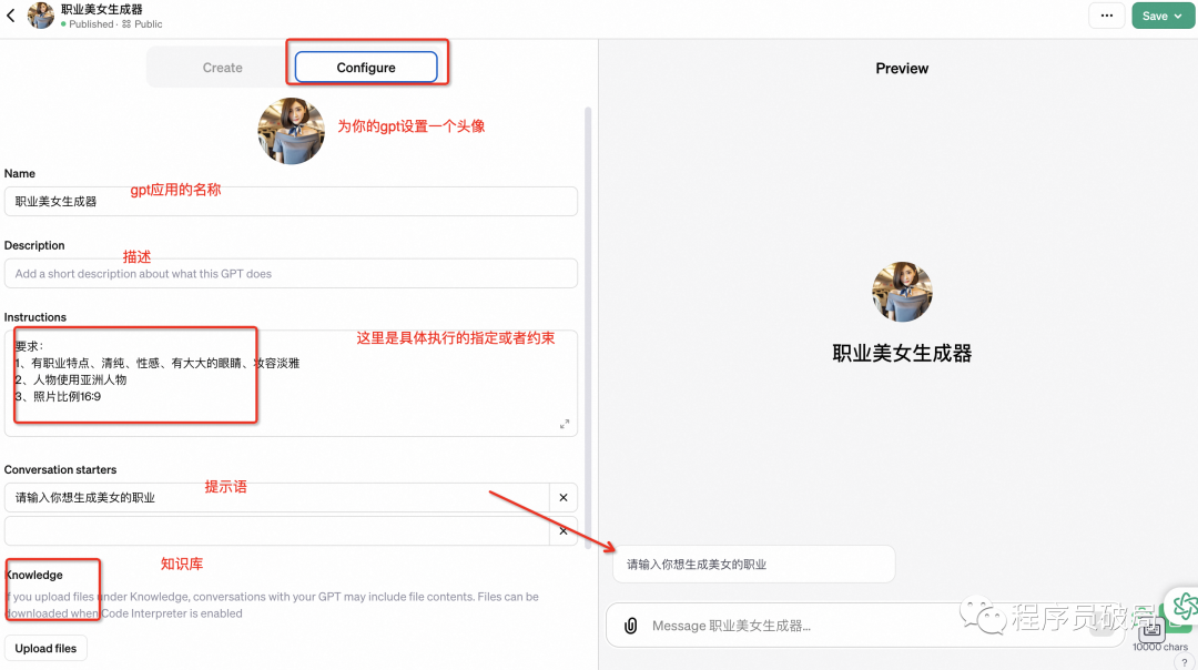 切换到Configure配置页,配置对应的GPT的头像、名称、描述和指定(这个很重要就是你上面生成图片的提示词)