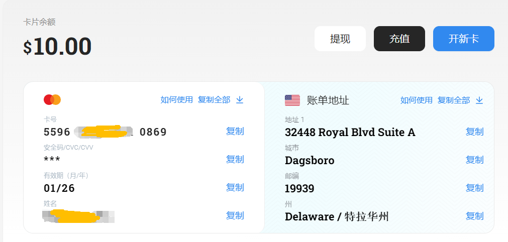 https://bewildcard.com/i/CHATGPT6 点击上面链接(使用推荐码 CHATGPT6 有 2美元 的优惠),按照指示完成实名认证,获得一个美国身份和虚拟卡,如下图所示。