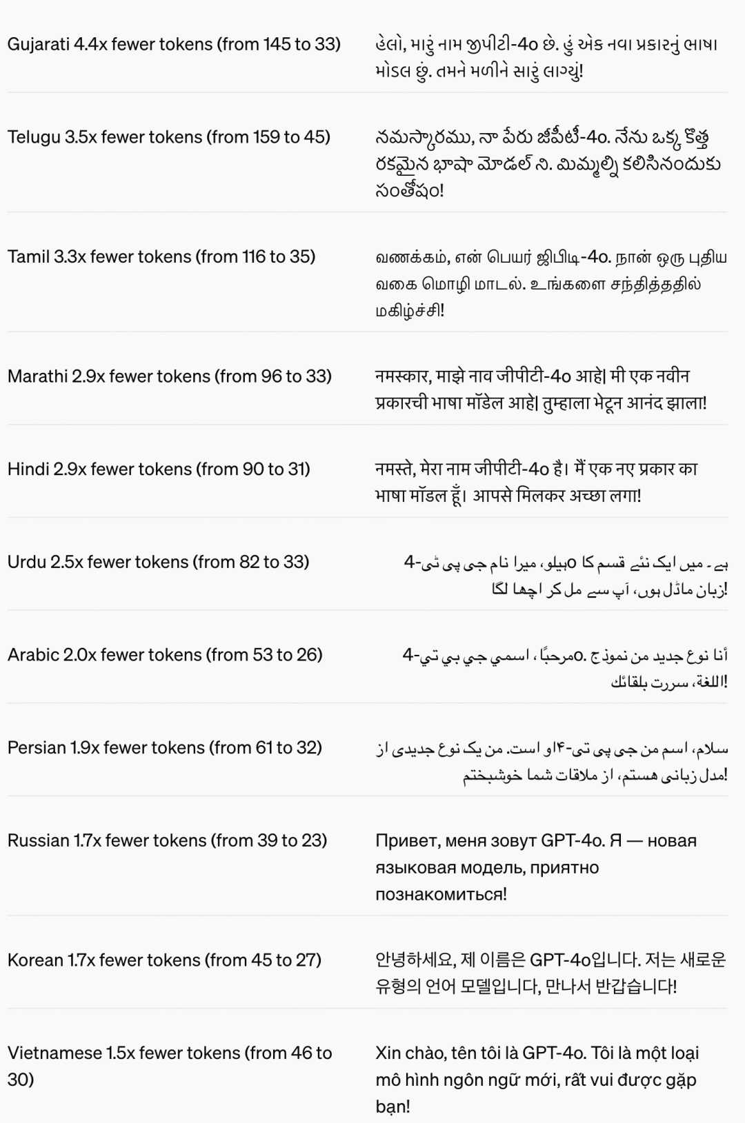 值得一提的是,OpenAI 还扩大了其语言支持范围,支持超过 50 种语言,包括多种印度语言。GPT-4o 在印度语言的词元使用上做了显著优化,例如,古吉拉特语减少了 4.4 倍,泰卢固语减少了 3.5 倍,泰米尔语减少了 3.3 倍,马拉地语和印地语减少了 2.9 倍。