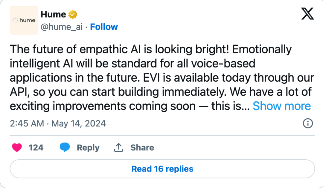 同时,发布了 EVI(Empathetic Voice Interface)的 Hume AI 也感到了压力,因此它们今天也发布了自己的 API 和一系列未来的改进计划。