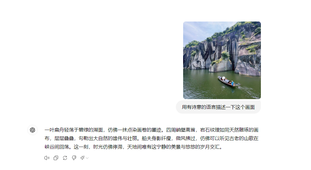 就比如你是一个旅游博主,但是在面对一个美景时,你突然词穷了,这时,你就可以打开GPT的视频对话,让它记录并描述眼前发生的一切。