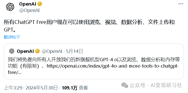 我们的使命包括为尽可能多的人提供先进的人工智能工具。每周有超过一亿人使用 ChatGPT。在接下来的几周里,我们将开始向 ChatGPT Free 用户推出更多的智能和高级工具。