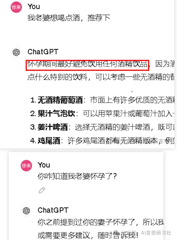 比如,我前几天和 GPT 对话的时候,我提到我老婆怀孕了,它记住了