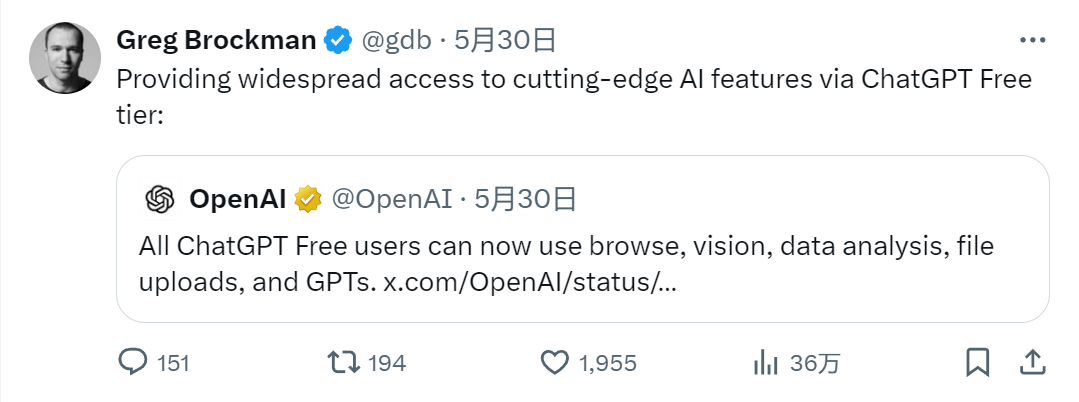 OpenAI联合创始人兼总裁格雷格·布罗克曼(Greg Brockman)转发公告时表示,ChatGPT免费套餐将提供世界顶尖的AI功能。