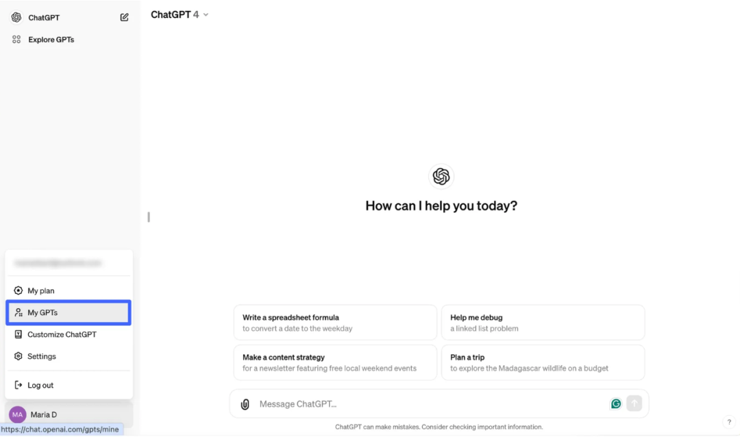 点击 ChatGPT 窗口左下角的你的姓名,进入你的账户。然后点击菜单中的“My GPT”。在这里你可以创建自己的 GPT 机器人。