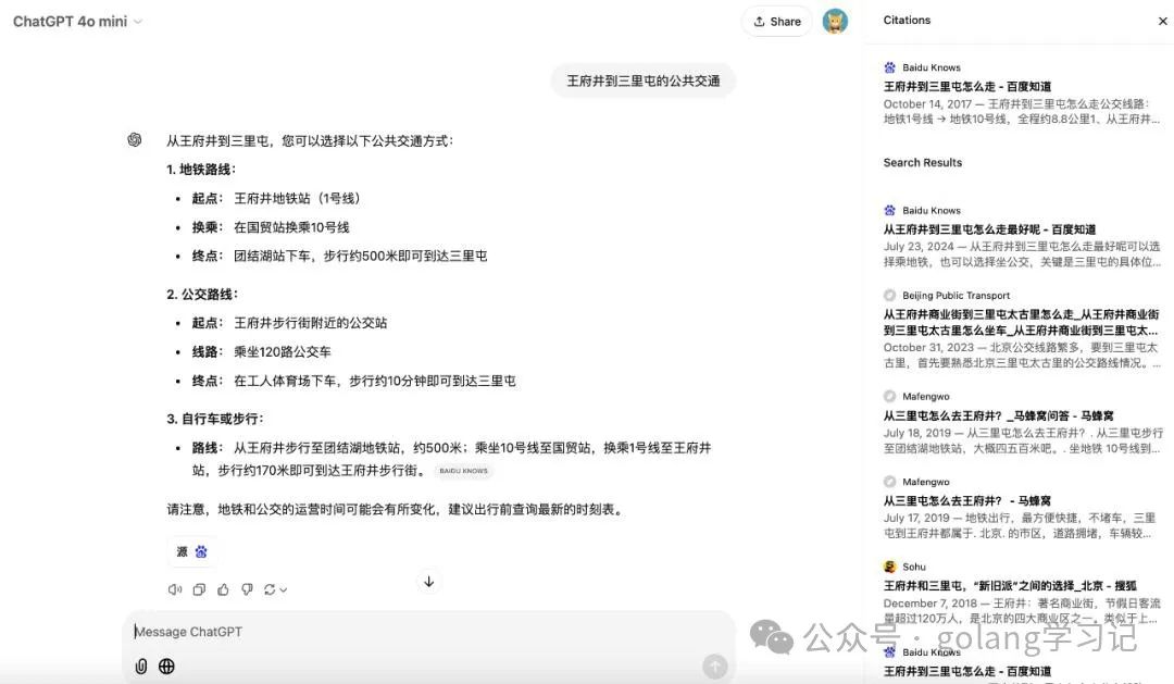 比如问它,王府井到三里屯的公共交通?ChatGPT search 也很快给出了清晰有用的答案。