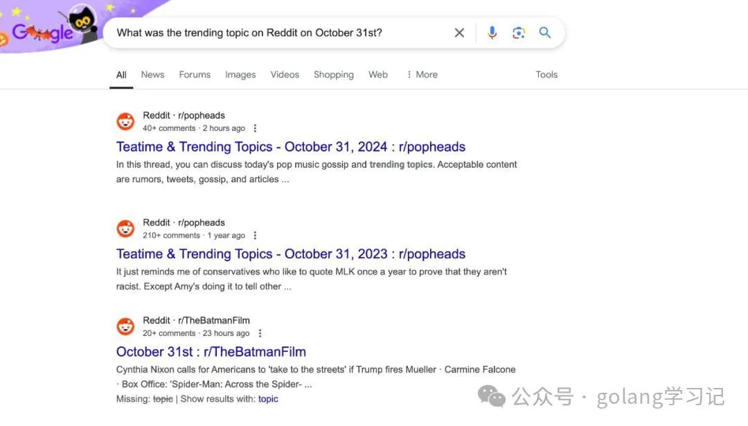 为了进一步测试 ChatGPT search 的实时性有多高,我问它,What was the trending topic on Reddit on October 31st。
