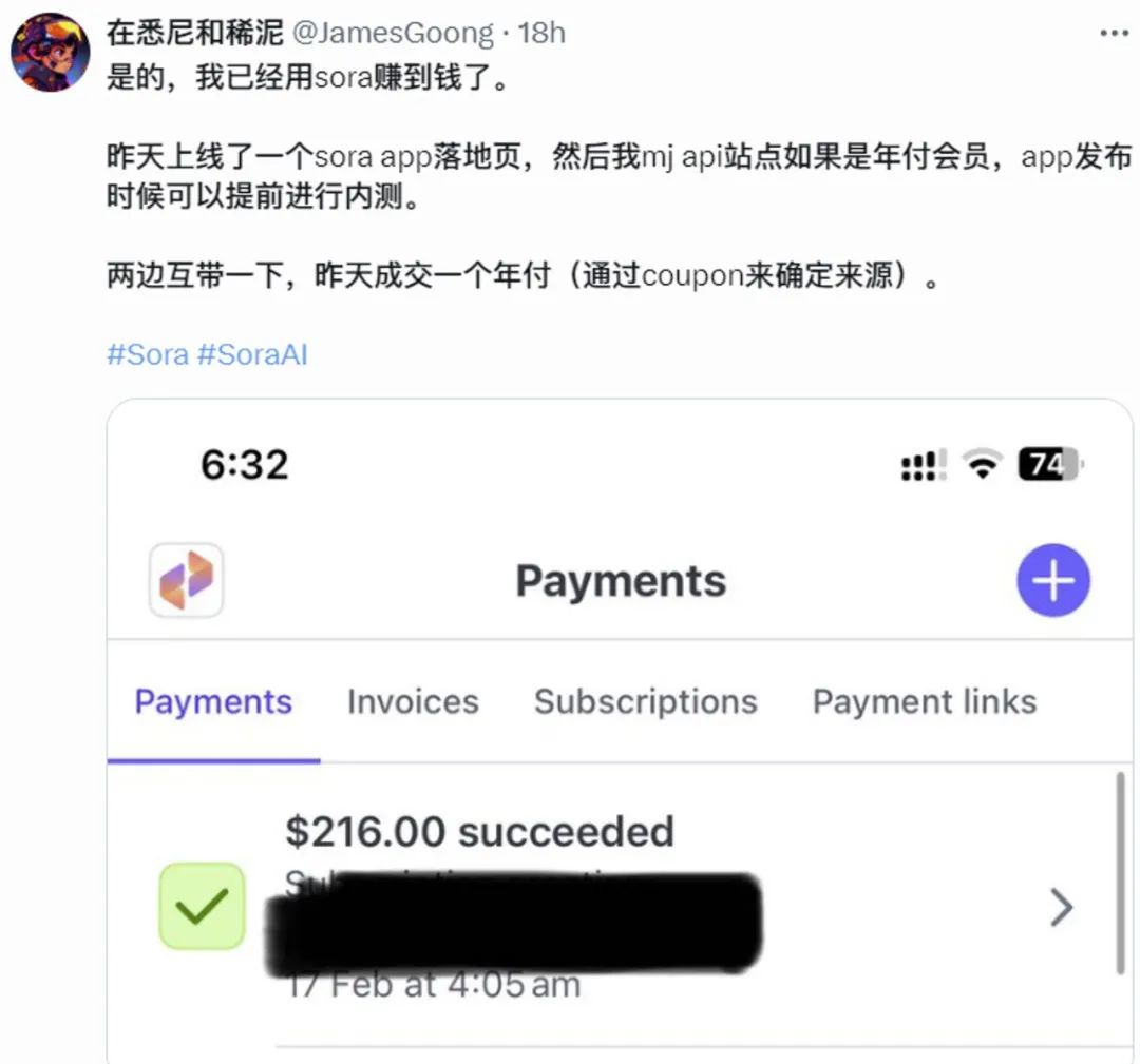 1、推特用户在悉尼和稀泥用户通过Sora引流变现216美元