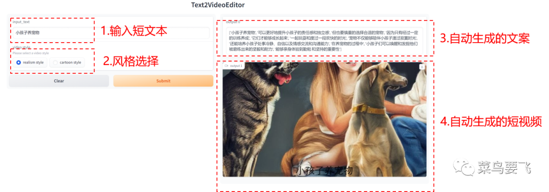 1. 短句转短视频(Text2Video)。根据输入的简短文字,生成短视频文案,并合成短视频。而且输入的文本支持使用ChatGPT生成。