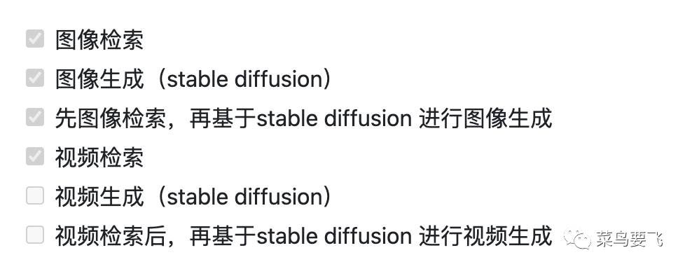 视觉信息生成上,支持图像和视频两种模态;生成方式上,支持检索和生成两种模型,目前共有6种模式: