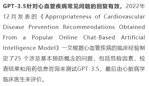 结果表明,GPT-3.5对心血管疾病相关问题回答的正确率出乎意料达到了84%(21/25),但是文中也针对部分可能会对患者有害的回答表示了担忧,例如人工智能模型在回答有关运动的问题时,坚定地推荐了锻炼心血管的运动,包括举重。