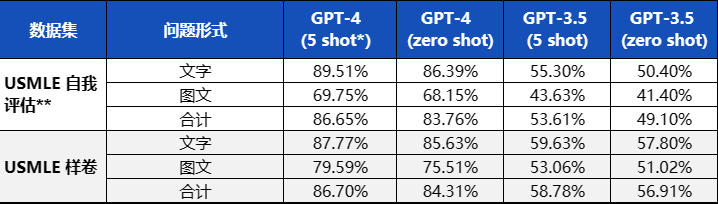 **USMLE自我评估的2173道题中有314道题是图文题(占数据集的14.4%),USMLE样卷的376道题中有49道题是图文题(占数据集的13.0%)