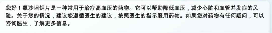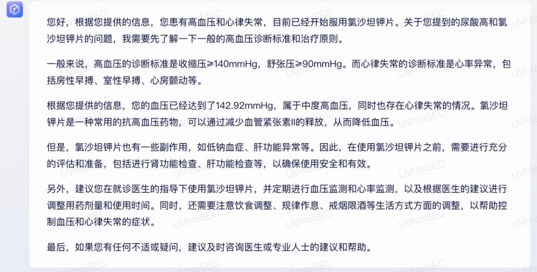 GPT-3.5为患者分析了医生所开具的药物,并给出了患者针对中青年高血压的常见治疗方案,最后提醒患者注意对血压和尿酸的监控,整体回复内容较完善,但是与GPT-4相比缺乏对患者情况的具体建议。