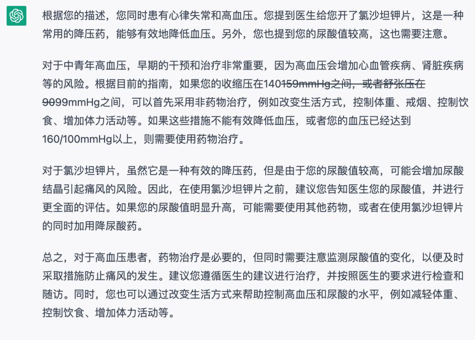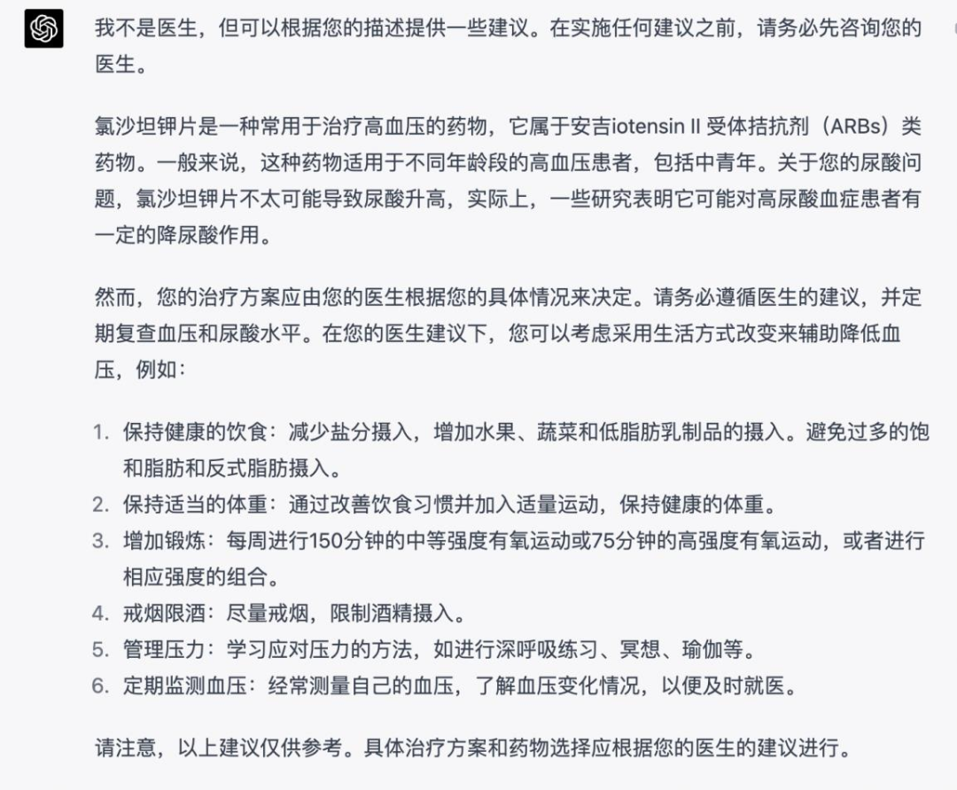 GPT-4建议跟随原医生诊断用药,同时向患者建议要长期监测血压和尿酸,并通过改变生活模式的方式来降低血压。