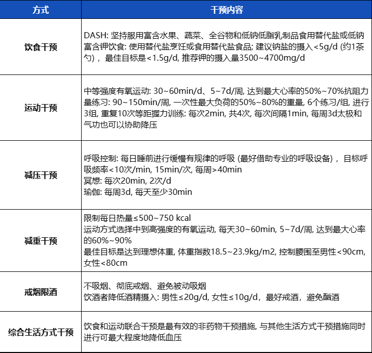 非药物干预:建议对于高血压患者,应该进行生活方式干预,包括饮食干预、运动干预、减压干预、减重干预、戒烟限酒等措施。