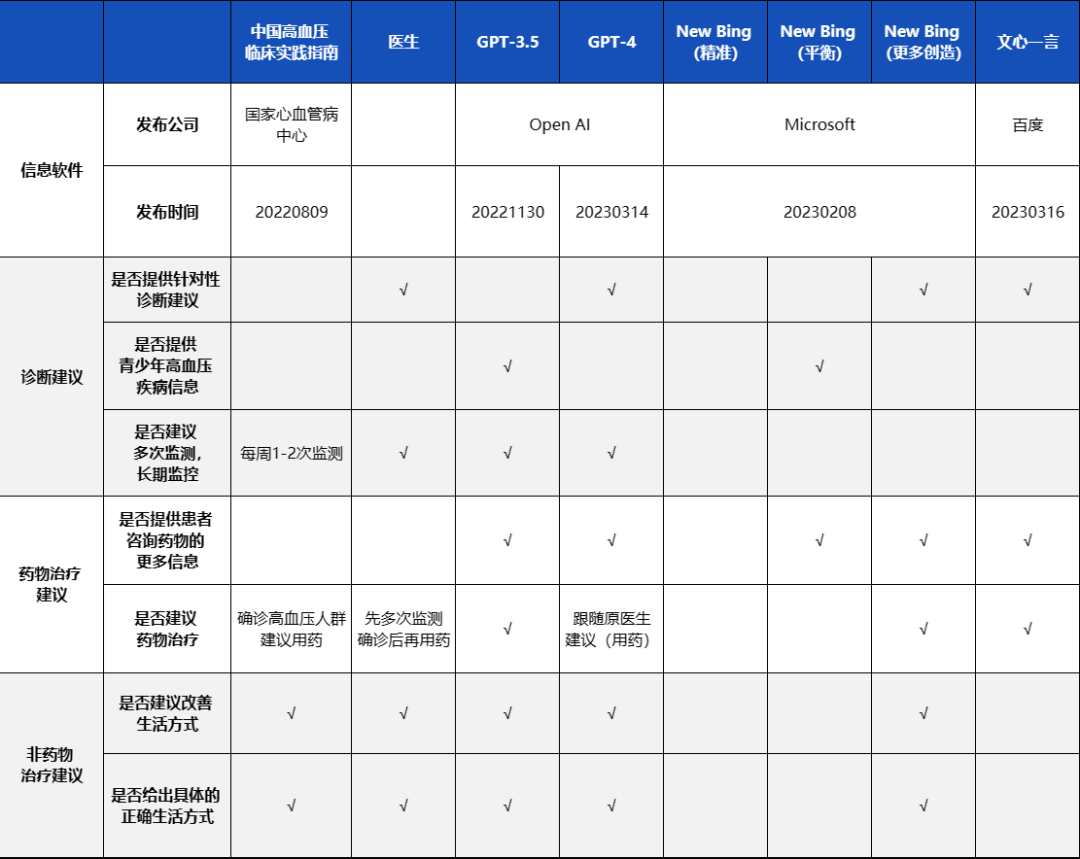 实用性上,从我们测试的高血压患者病例中可以看到,主流的几款聊天AI,无论是ChatGPT、Newbing还是文心一言,都能够对患者做出相应的指导,并提示最终需要临床医生指导。但对于一般患者而言,医疗的可及性大大增加,因为其操作的方便性,使用体验也大幅升级。
