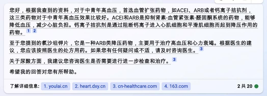 精准模式和平衡模式针对医学问题的建议较为谨慎,仅提供了基本的药物信息和中青年高血压信息。