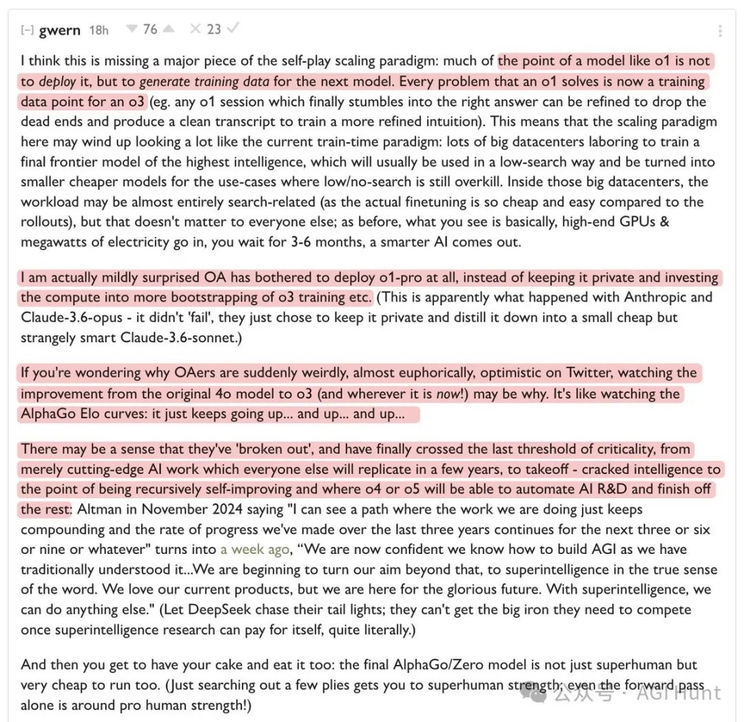 Gwern对OpenAI发布o1-pro都感到些许惊讶,认为他们本可以将这些计算资源用于o3的自举训练。