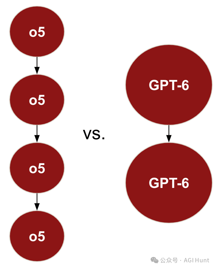 如果第一批AGI(例如o5)采用推理计算范式,它们的参数量可能比传统同等性能的模型(如GPT-6)要小得多。