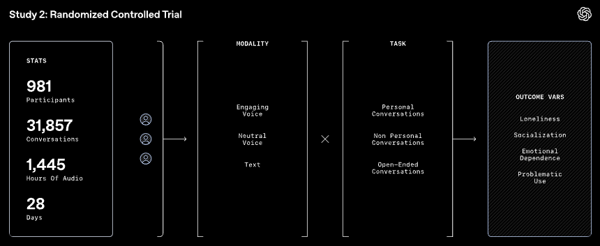 🔹随机对照实验:MIT媒体实验室组织了1000名用户,进行为期四周的实验,观察ChatGPT不同使用方式如何影响用户的孤独感、社交互动、情感依赖以及AI过度使用问题。