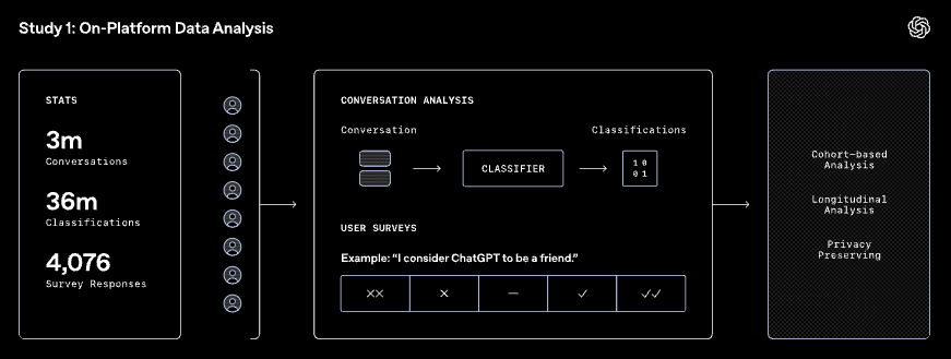 🔹大规模数据分析:OpenAI研究团队分析了近4000万次ChatGPT互动记录,并结合用户调查,看看大家实际是怎么使用AI的,以及它对用户情绪有没有什么影响。