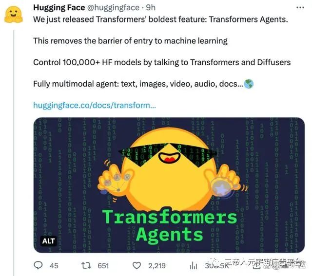 这是抱抱脸最新上线的功能HuggingFace Transformers Agents,一经推出就获得极大关注: