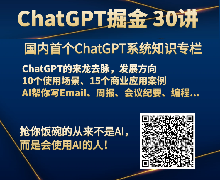 于是,我基于自己10多万字的学习笔记,跟团队6位小伙伴,经过20多天的写稿,15次的稿件打磨,终于完成了专栏《ChatGPT掘金 30讲》,这是一个语音+文字稿形式的在线课程,目前已经上线了30节,近期追加更新5~6节。