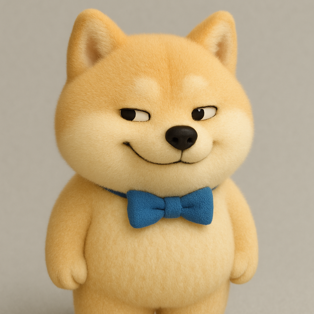 创建图片:一个戴着深蓝色蝴蝶结领结的柴犬,表情参考我上传的图片,3D风格,毛绒绒质感,不要太逼真,比例为1:1
