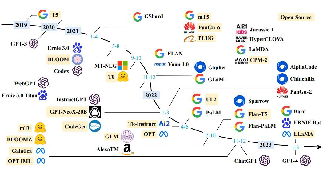 因为相关技术发展迅速,三部分内容也会定期更新。本文主要为第一部分经典论文学习,而相关的工作众多(如图),一一阅读并不现实,因此本文选择持续性最高的 OpenAI 系列和 Google 系列,以及近期影响力比较大的 LLaMA,最后是中文适配比较好的 GLM 和 ChatGLM。
