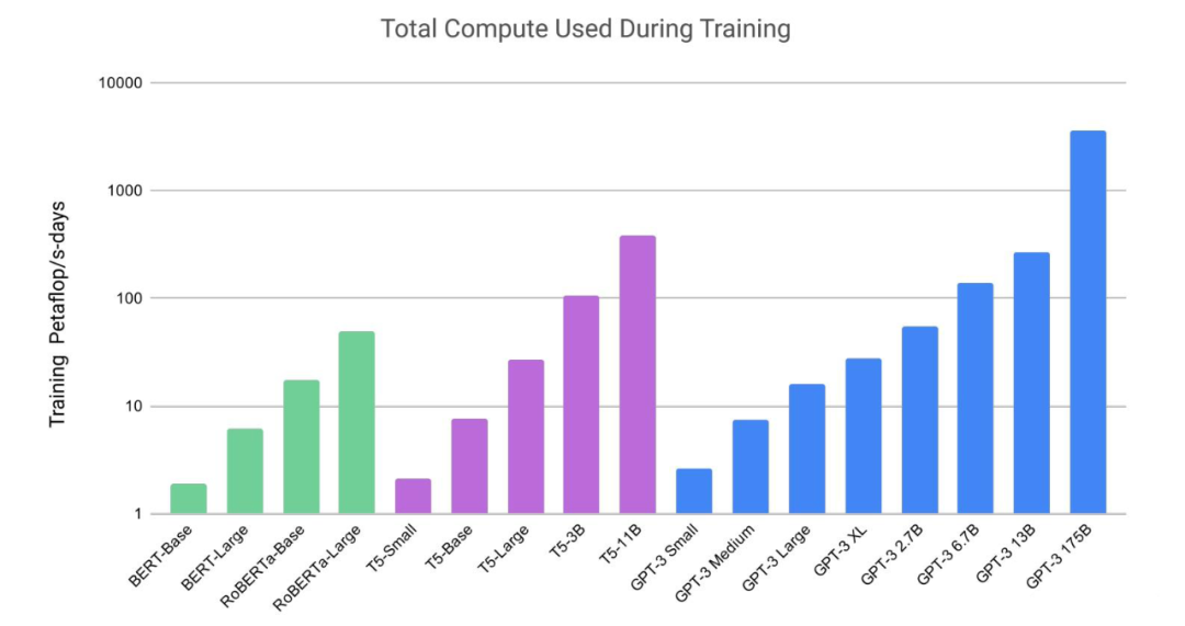 模型训练方式:前面提到了,相对 GPT-2 没有创新,就是更大模型、更多更丰富的数据、更长的训练时间,不止于 Zero-Shot,还做 One-Shot 和 Few-Shot 任务(这里的 x-Shot 是不微调模型的,也就是所谓的 In-Context learning,而在预训练阶段没有特殊操作),如图。 模型:沿用了 GPT-2 的结构,在模型初始化、归一化、Tokenization 做了一些优化,另外也“抄”了一些类似 Sparse Transformer 的优点(总之是加了一些同期一些被验证有效的操作,或自己验证有效的小操作)。为了验证模型容量带来的效果,文章训练了多种大小的模型,最大的 175B 的叫 GPT-3。为了训练大模型,还做了一些模型并行和提效的工作(其实这部分也比较重要,但是没有展开说)。模型大小参数,以及同期一些工作的训练资源开销对比如图: 训练数据准备: