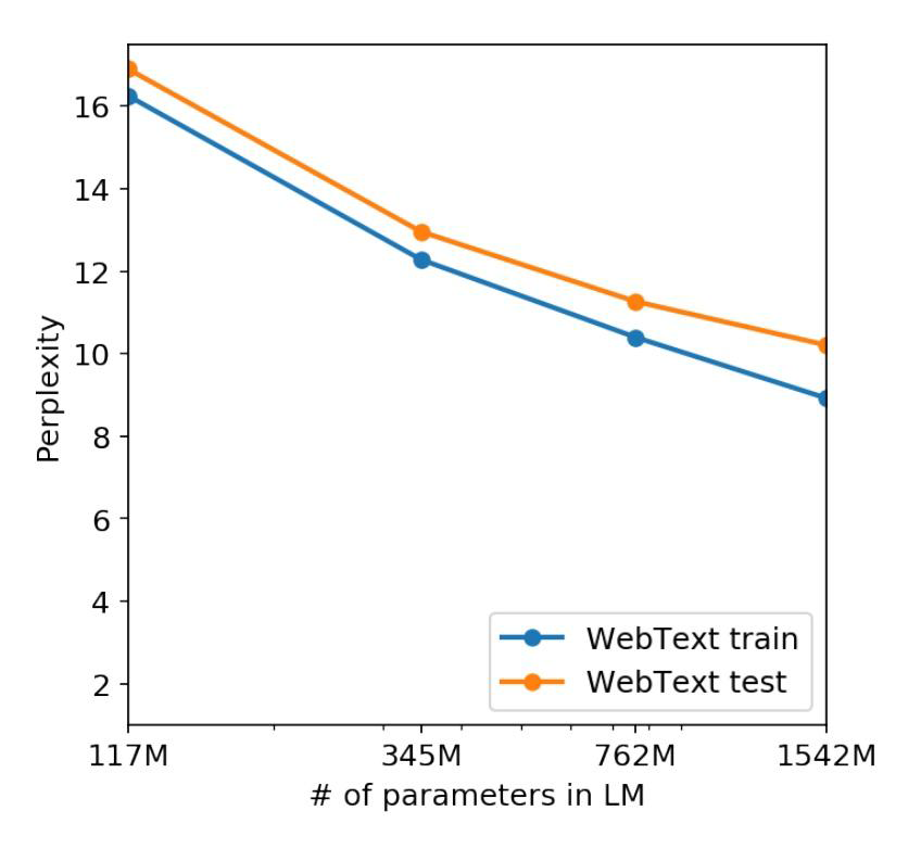 模型的选择使用 WebText 的 5% 作为验证数据,实验发现所有大小的模型仍然是欠拟合状态,随着训练时间的增加,在验证集上的效果仍然可以继续提升。