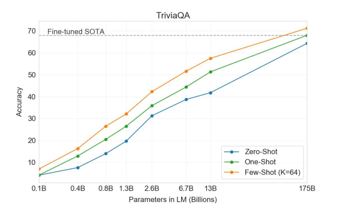 从主要结论曲线,可以明显发现,few-shot 比 zero-shot 效果好,模型越大越好(废话),而且 175B 好像也没到极限,模型更大效果可能还会继续上升。