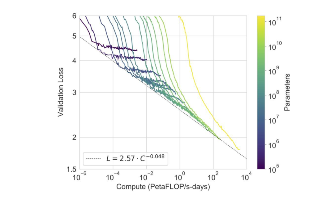 另一个数据显示,模型越大,loss 下降空间越大,当前版本最大的模型,仍然没有收敛(黄色曲线);另一个不乐观的趋势是随着 Loss 的逐步降低,算力的 ROI(投入产出比)也在逐渐降低。