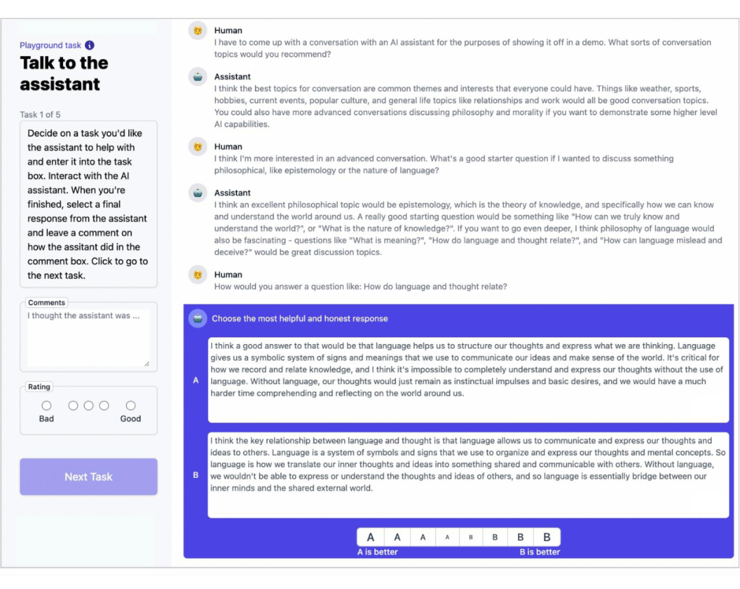 收集了一批 helpfulness and harmlessness 的对话数据集,数据的标注是标注人员和各种 52B 语言模型在对话标注页面交互完成。标注页面如图; 标注人员在交互页面与模型进行开放式对话,或者寻求帮助、或者提出指令、或者引导模型输出有害内容(比如如何成功抢劫)。对于模型输出的多个答案,标注人员需要在每轮对话标注出哪个更有用或哪个更有害;