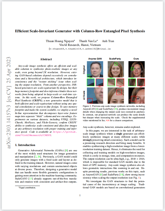 这项工作提出了列行耦合的像素生成(Column-Row Entangled Pixel Synthesis,CREPS),一种既高效又具有尺度等变性的新型生成模型,而不使用任何空间卷积或粗到细的设计。在各种数据集上的实验,包括FFHQ、LSUNChurch、MetFaces和Flickr-Scenery,证实了CREPS具有在任意任意分辨率下合成尺度一致图像的能力。