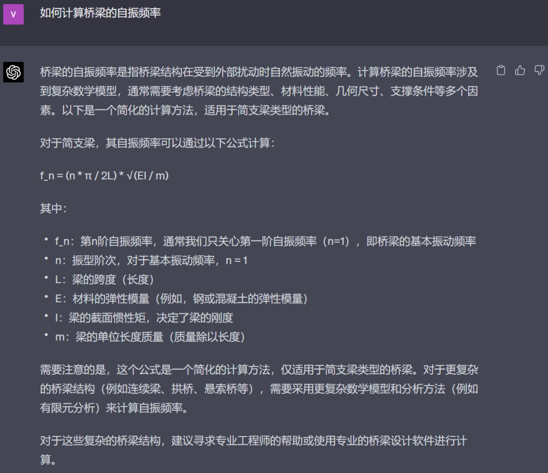 ChatGPT的强大能力确实引发了一些担忧,就连马斯克也在公开呼吁暂停GPT-5的开发,人们都在好奇,到底哪些工作会被取代?我们让ChatGPT回答一些专业问题浅浅探讨一下,以计算桥梁的自振频率为例。