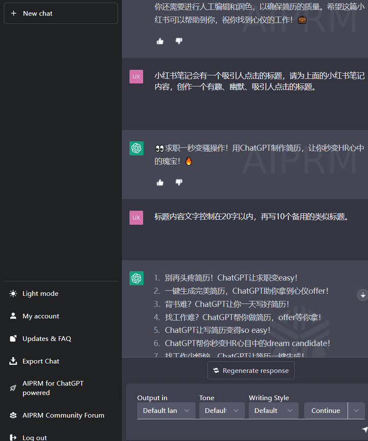 在小红书上,我们可以直接使用这种方法:将我们找到的优秀笔记作为示例展示给ChatGPT,并要求它模仿这些笔记,以给定的主题"推荐使用ChatGPT制作求职简历"进行创作。这种模式要求小红书笔记创作者对热门笔记有一定了解,能够找到适合自己对标的热门笔记。在这种模式下,ChatGPT给出的答案相对效果更佳。
