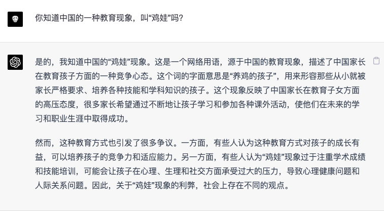 首先,你要跟ChatGPT确认它是否了解中国的鸡娃现象,毕竟有时候它也会胡言乱语。