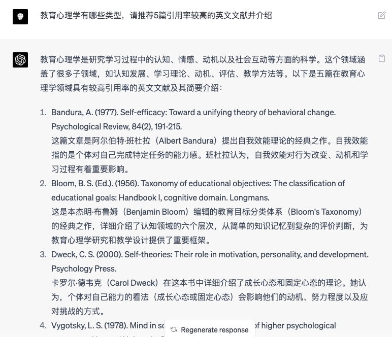 然后抛出这个Prompt:教育心理学有哪些类型,请推荐5篇引用率较高的英文文献并介绍。