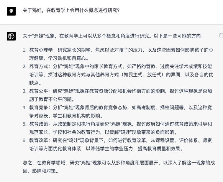 你肯定不能整篇论文都是“鸡娃躺平”之类的网络用语,这时候,就需要进一步问ChatGPT:关于鸡娃,在教育学上会用什么概念进行研究?