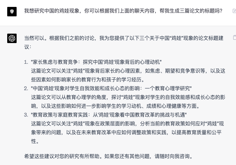 你可以要求它根据之前的对话内容,先给你三个标题。选定某一个标题之后,就让它给你延伸出论文大纲。