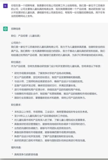 比如,我告诉ChatGPT我需要招聘一个产品经理来推动研发部门设计开发更好的儿童玩具。请根据市场上的岗位类型,帮我撰写一份完整的招聘信息,以便在专业招聘网站上发布。